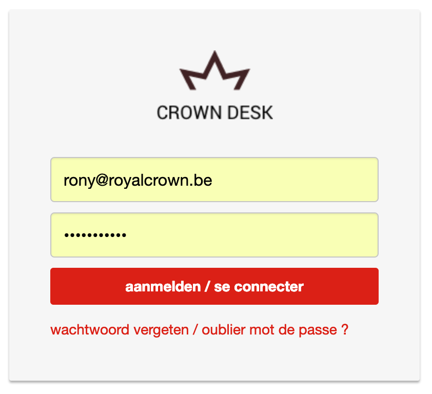 AANMELDEN Surf naar http://crowndesk.be en meld u aan met uw emailadres en wachtwoord. Wachtwoord vergeten ? Klik op de link “wachtwoord vergeten” en geef uw emailadres in. U ontvangt enkele seconden later een email met daarin uw wachtwoord. |