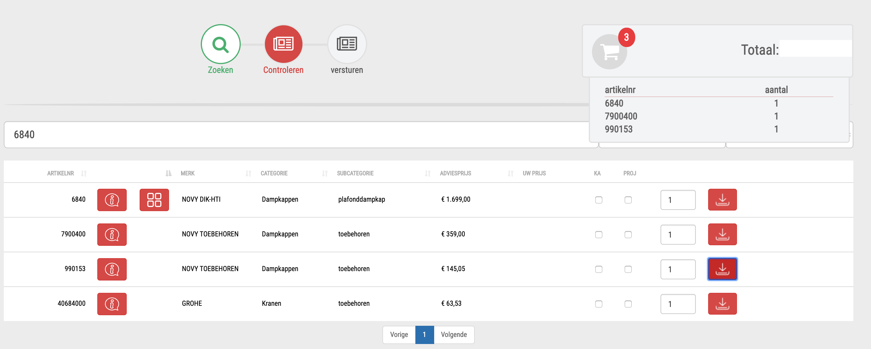 | Door te bewegen over het winkelwagentje ziet u de inhoud er van. Er wordt steeds het aantal artikelen getoond dat zich in uw bestelling bevindt. U ziet ook real-time de totale kostprijs van uw bestelling. Door te klikken op “controleren” krijgt U de kans om uw bestelling nog aan te passen of te bevestigen. |